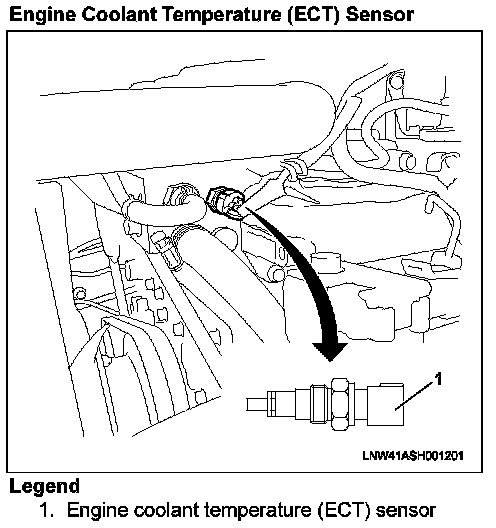 Engine Coolant Temperature (ECT) SensorThe engine coolant temperature (ECT) sensor is installed on the thermostat housing. It is a variable resistor. The ECT sensor has a signal circuit and a low reference circuit. The ECT sensor measures the temperature of the engine coolant. The engine control module (ECM) supplies 5 volts to the ECT signal circuit and a ground for the ECT low reference circuit. When the ECT sensor is cold, the sensor resistance is high. When the engine coolant temperature increases, the sensor resistance decreases. With high sensor resistance, the ECM detects a high voltage on the ECT signal circuit. With lower sensor resistance, the ECM detects a lower voltage on the ECT signal circuit.