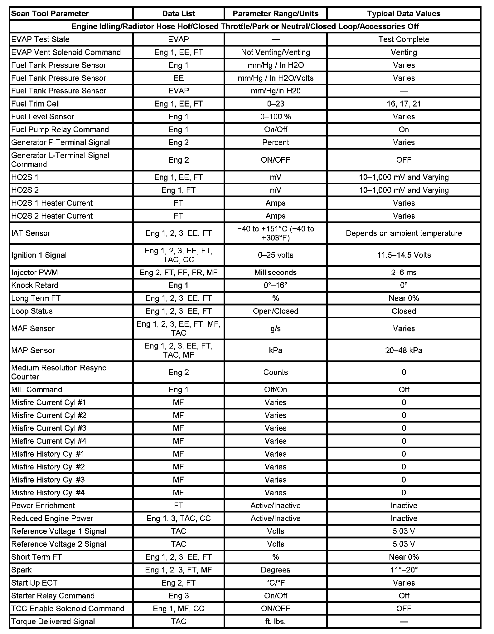 Scan tool values from a properly running engine may be used for comparison with the engine you are diagnosing. The Engine Scan Tool Data List represents values that would be seen on a normal running engine.