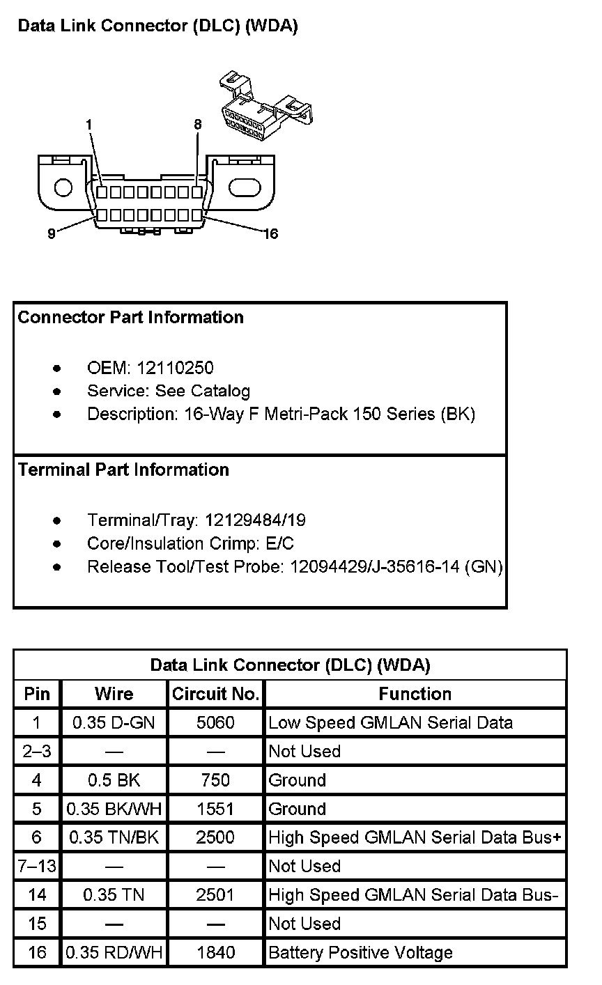 Data Link Connector (DLC) (With RPO Code WDA) Pin 1 To 16: