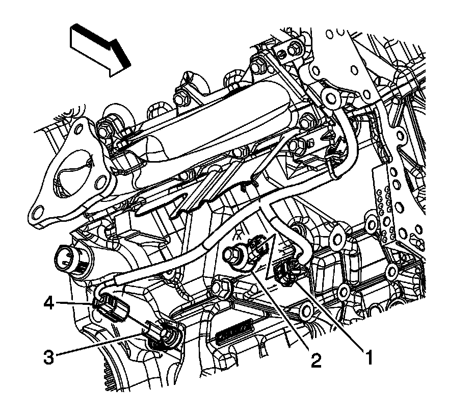 2. Disconnect the engine wiring harness electrical connector (1) from the bank 1 knock sensor (2).