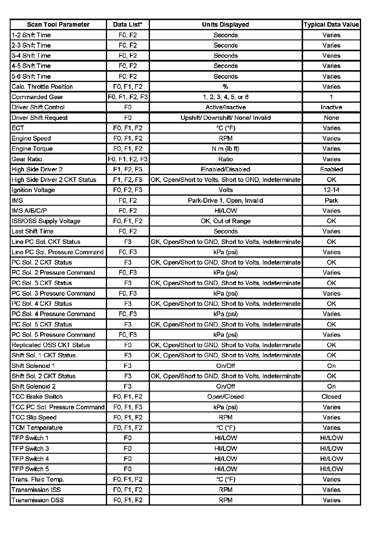 Only the parameters listed below are used in this manual for diagnosing. If a scan tool displays other parameters, the values are not recommended by General Motors for use in diagnosis.