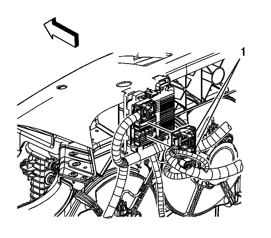 Gently lift up the retaining tab (1) and lift the ECM up and out of the support brackets on the ECM bracket.