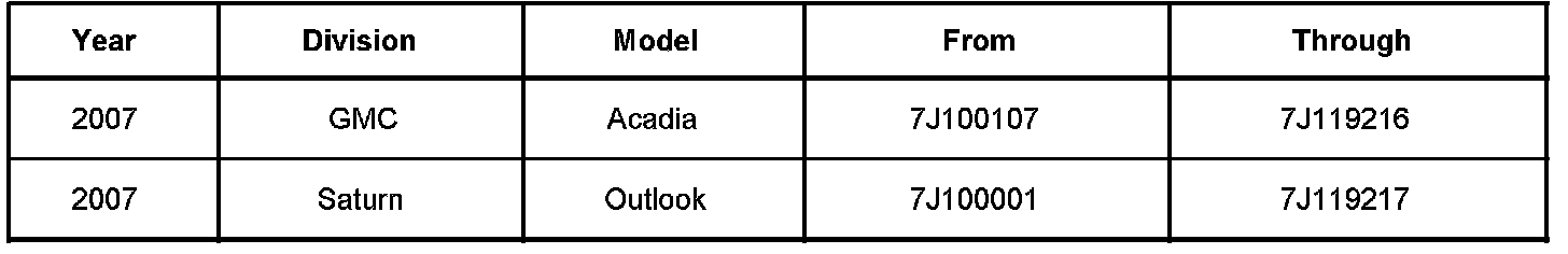 Involved are *certain* 2007 GMC Acadia and Saturn Outlook vehicles built within the VIN breakpoints shown