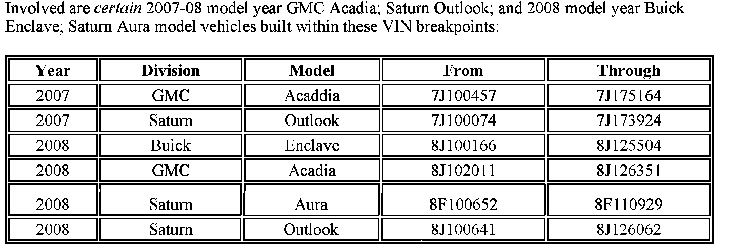 ^ 2008 GMC Acadia; Saturn Outlook, Aura ; and Buick Enclave: Use data version 8.5 for 2007 or later, available on TIS 2 Web 08/19/07; and on TIS DVD version 9.0/ 2007 or later, mailed to dealers beginning 09/12/07