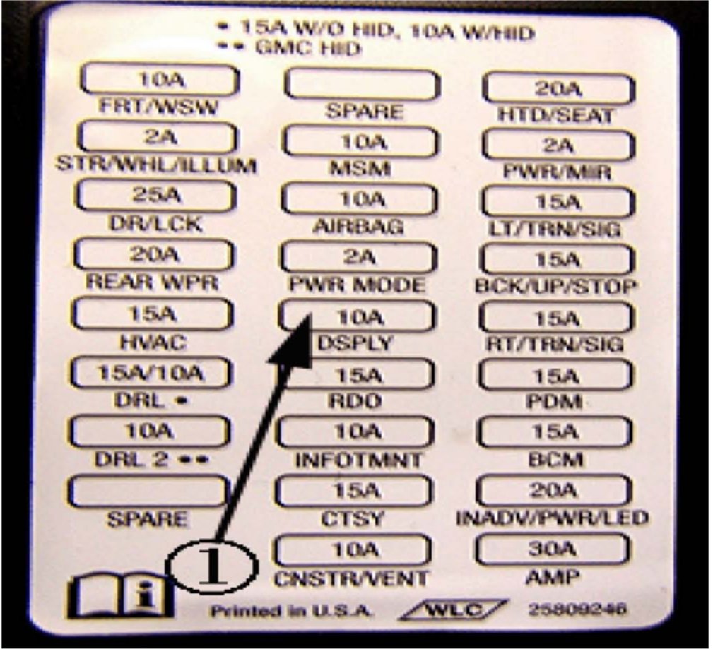 6. Remove 10 amp Display fuse (1), wait at least 5 seconds, then re-install 10 amp display fuse.
