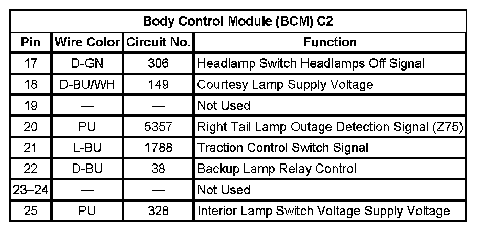 Body Control Module (BCM) C2 (Pin 17 To 25):