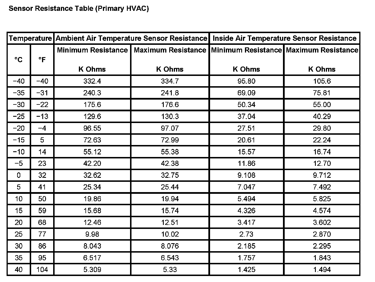 Sensor Resistance Table (Primary HVAC):