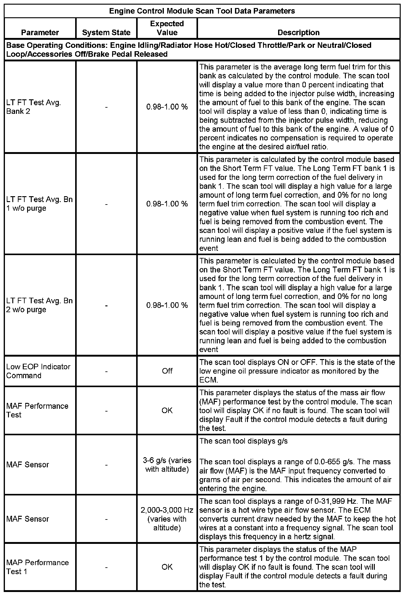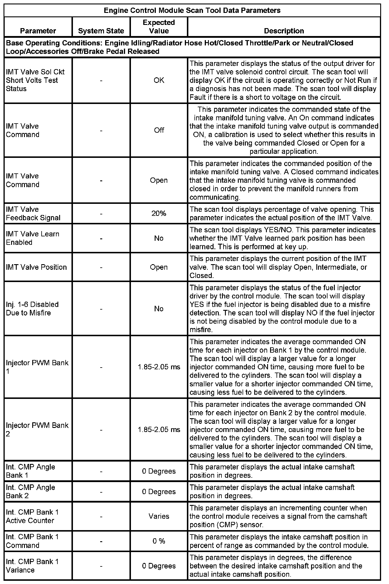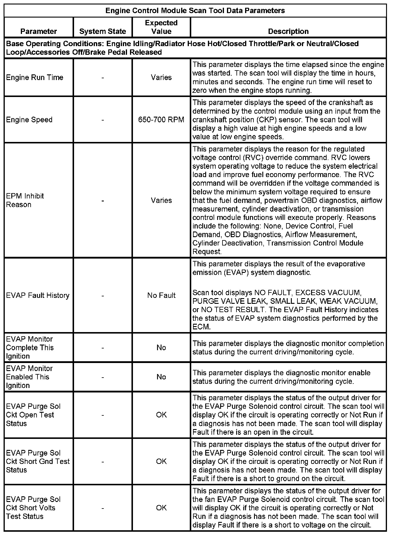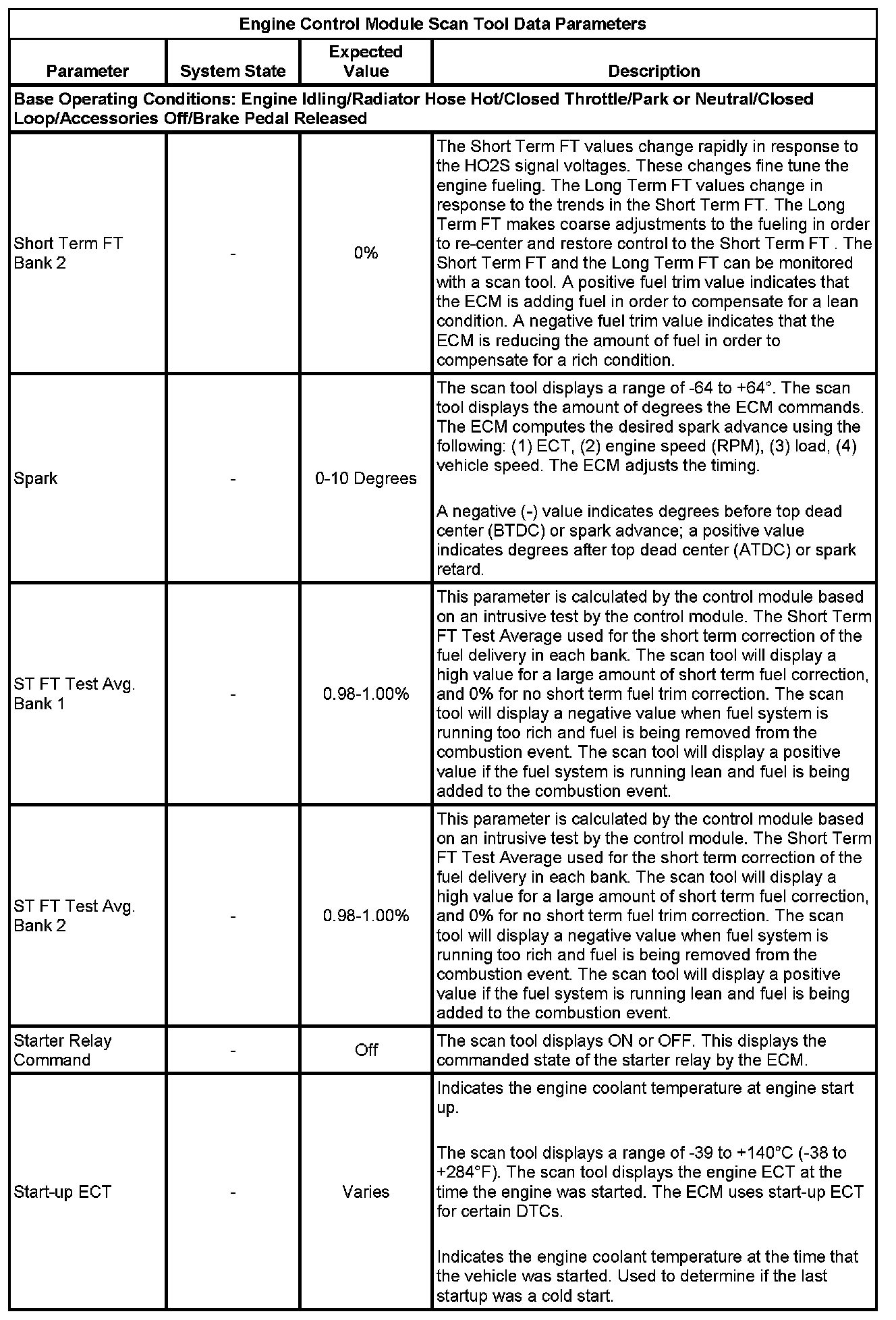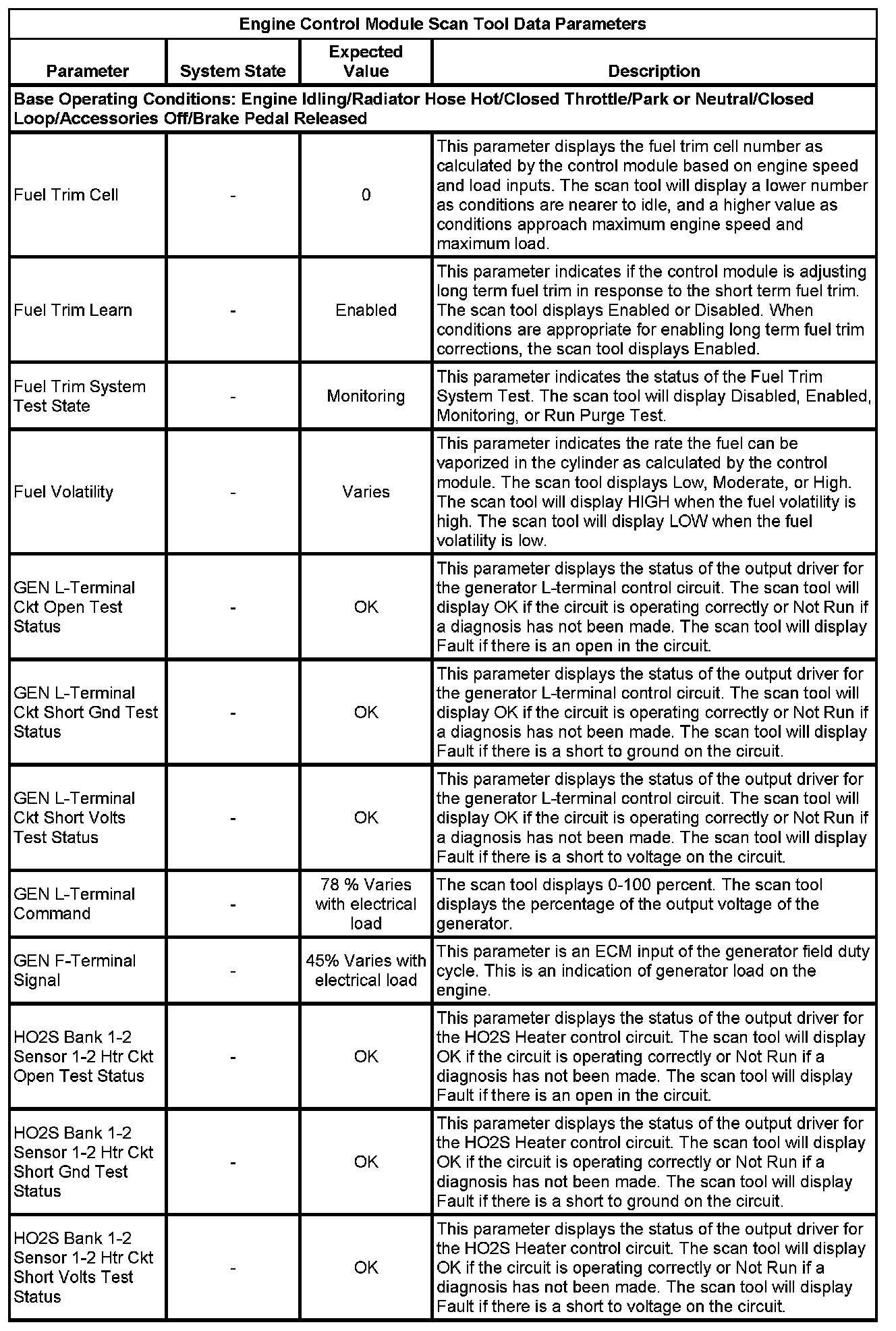 The Engine Control Module Scan Tool Data List contains all engine-related parameters that are available on the scan tool. The list is arranged in alphabetical order. A given parameter may appear in any one of the data lists, and in some cases may appear more than once, or in more than one data list in order to group certain related parameters together.