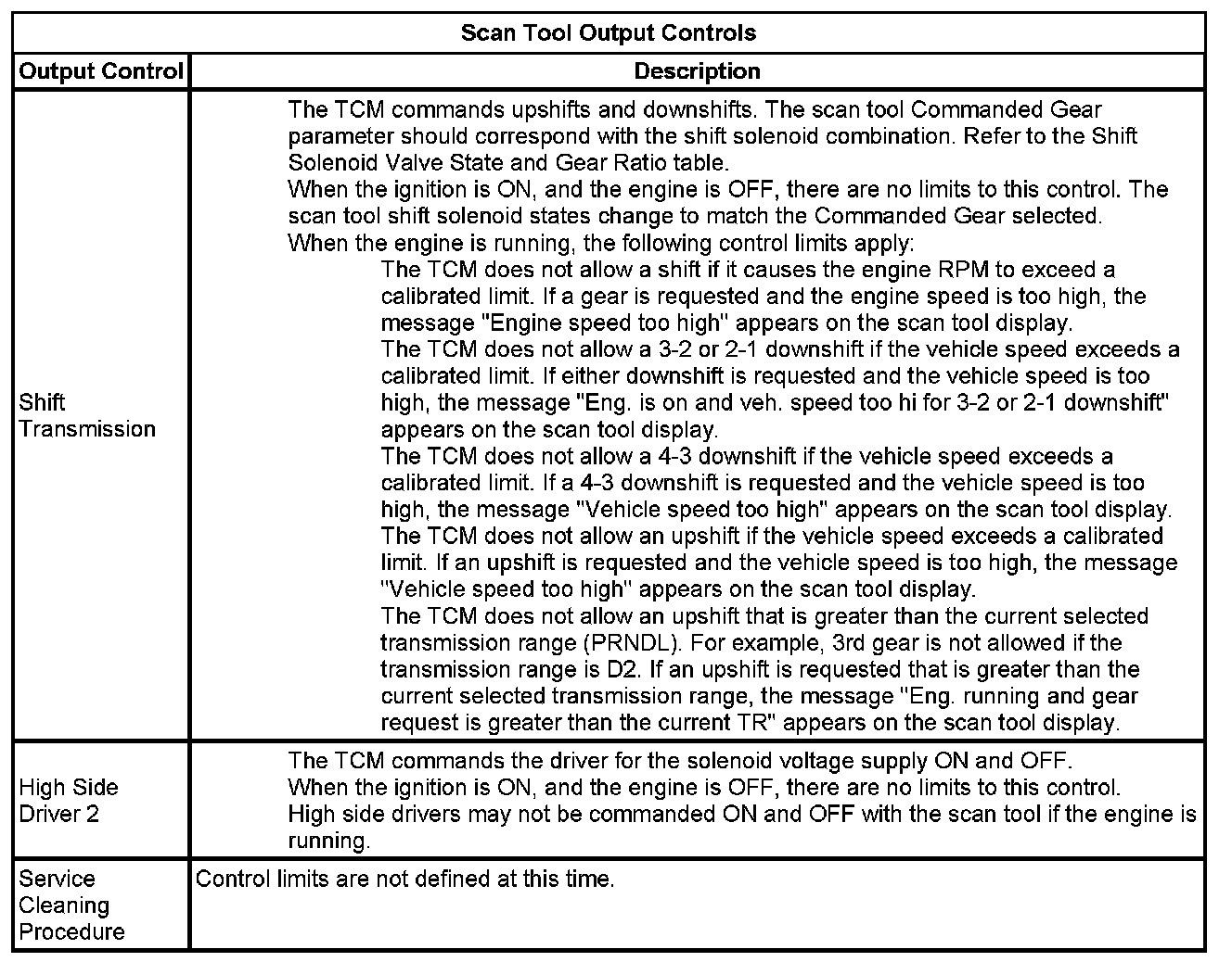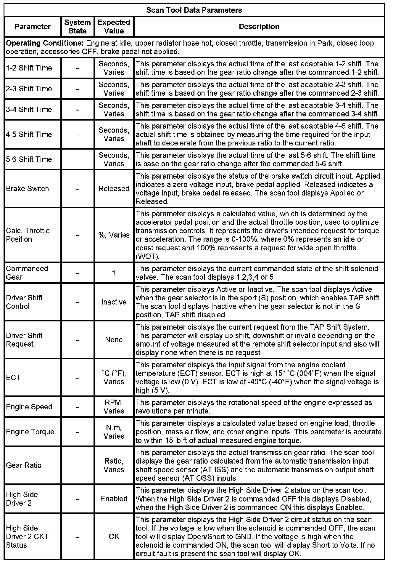 The Transmission Control Module Scan Tool Data List contains all transmission related parameters that are available on the scan tool. The list is arranged in alphabetical order. A given parameter may appear in any one of the data lists, and in some cases may appear more than once, or in more than one data list in order to group certain related parameters together.