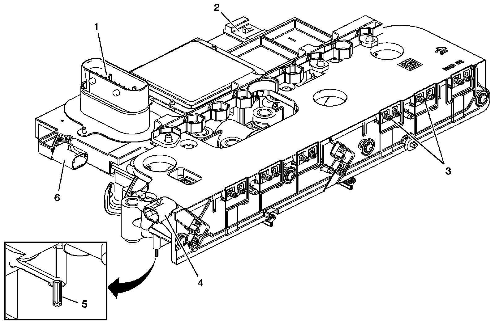 4. Inspect the 4 control solenoid (w/body and TCM) valve assembly filter plate retaining tabs (5) for cracks and ensure proper tension when filter plate is attached.