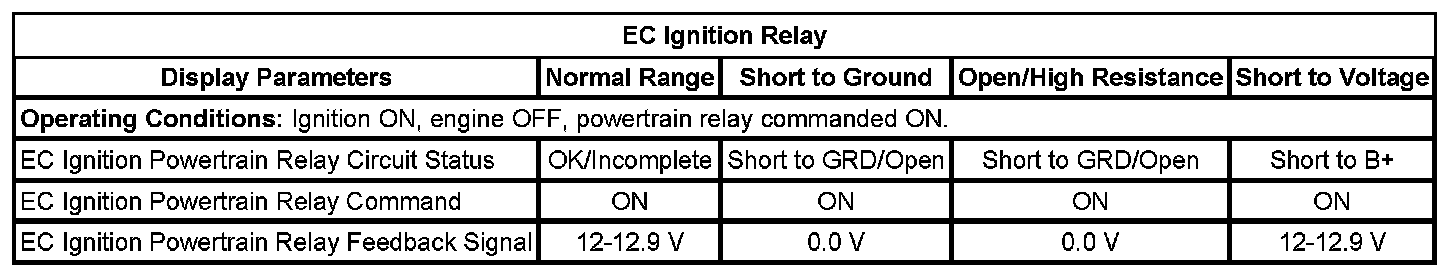 12. Ignition ON, engine OFF, monitor the EC Ignition Relay Feedback parameter with a scan tool. The parameter should display B+.