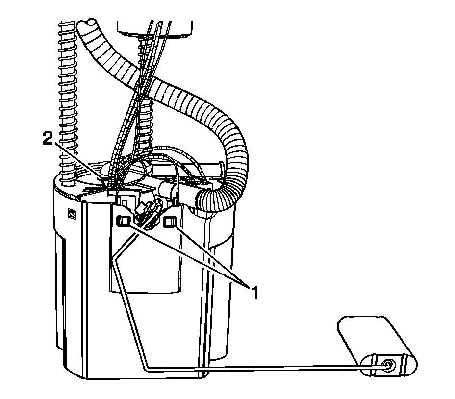4. Gently push in the fuel level sensor retainers (1), disengaging them from the module reservoir.