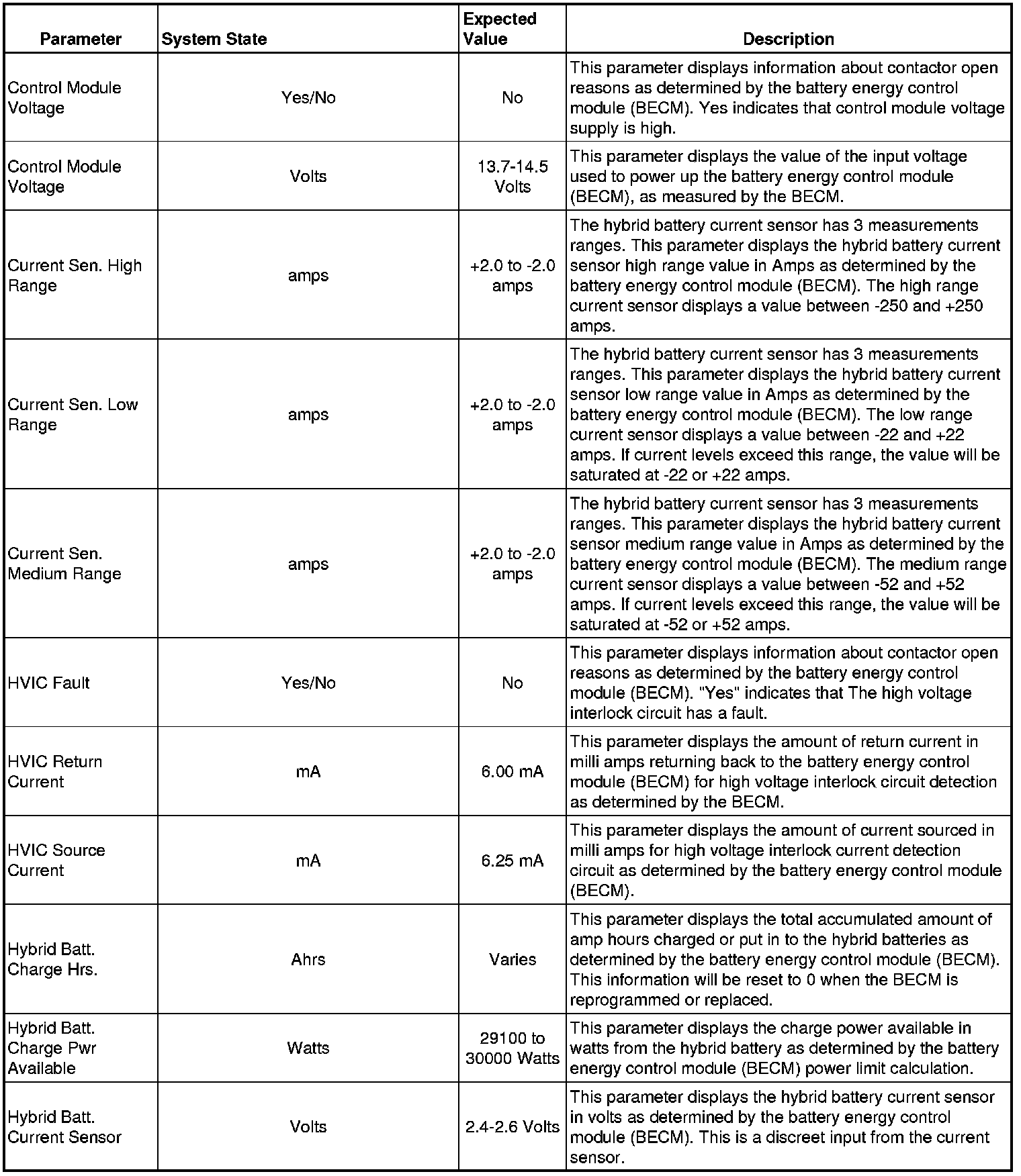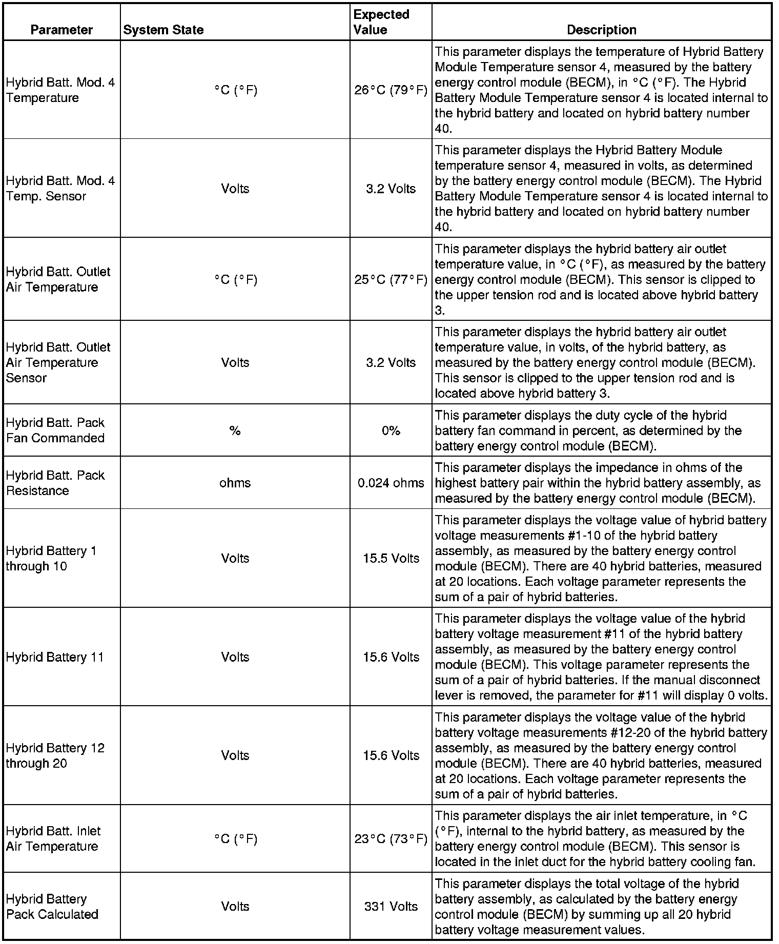 The Drive Motor Generator Battery Control Module Scan Tool Data List contains all Hybrid Battery related parameters that are available on the scan tool. The list is arranged in alphabetical order. A given parameter may appear in any one of the data lists, and in some cases may appear more than once, or in more than one data list in order to group certain related parameters together.
