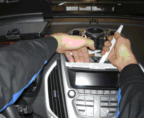 Insert a plastic body trim tool between the IP and radio control assembly along the top portion of the radio control assembly as shown in the illustration. DO NOT use a flat-blade screwdriver to remove the radio assembly.