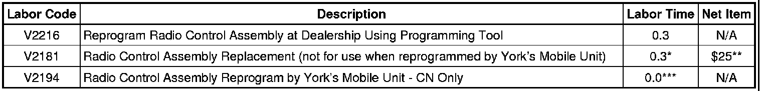 *** Dealers are to claim only administrative allowance of 0.2 hours when the radio control assembly is reprogrammed by York's Mobile Unit. Dealers using WINS should submit 0.2 hours administrative allowance in labor time. Dealers using GWM should submit 0.2 hours administrative allowance under Administrative Time.