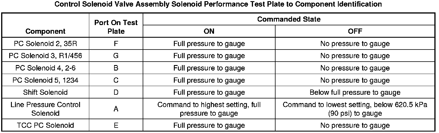 The purpose of this procedure is to test the functionality of the control solenoid valve assembly solenoids for a gross stuck open or stuck closed condition. DT-48616 - test plate is bolted to the control solenoid valve assembly on the valve body mounting surface. Pressurized air is passed into the aluminum test block, through the control solenoid valve assembly solenoid passage and back to a pressure gauge on the test block. The pressure gauge indicates open if air pressure is passed through the solenoid, or closed if the solenoid is unable to pass air through. A scan tool is used to command the solenoids ON and OFF. While watching the pressure gauge, one can determine the valve functionality. The recommended shop air pressure for this test is 90-100 psi.