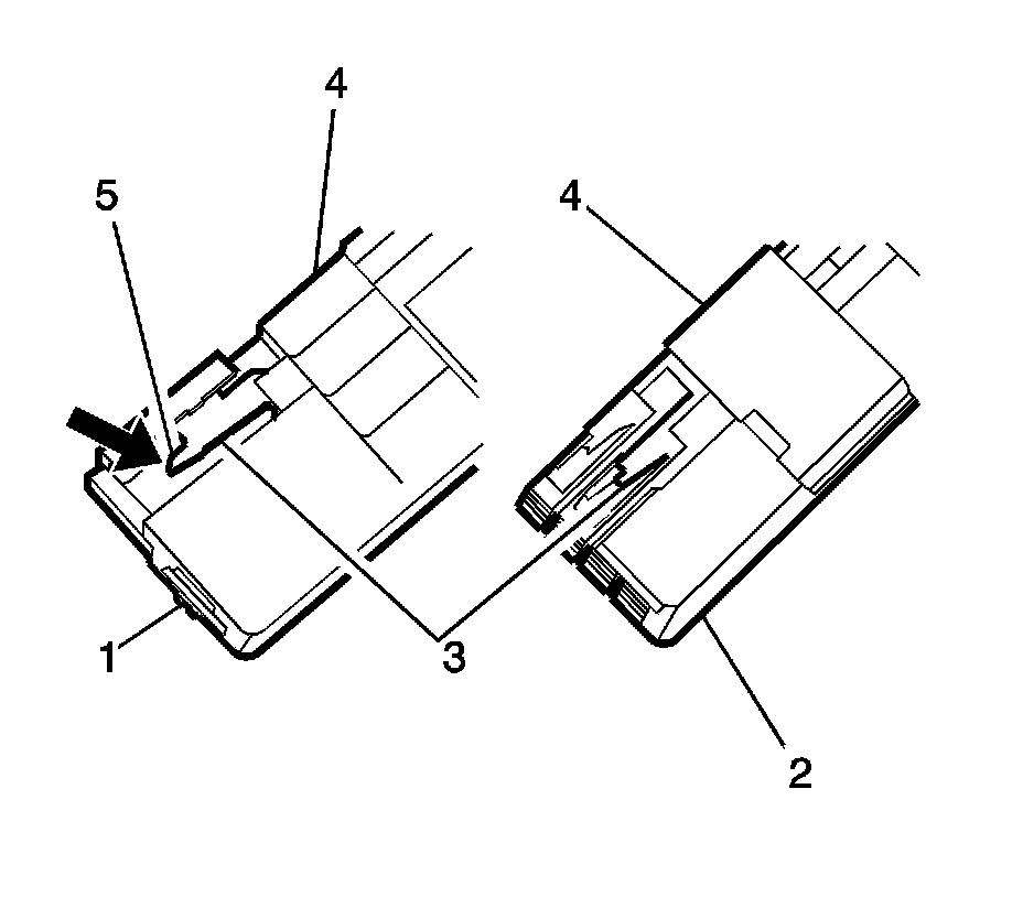* Place the tip of the connector terminal release tool onto the connector lance (3) and deflect the lance to the right (5) to release the lock. Hold this released position.