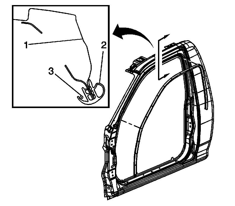 3. Remove the front door opening weatherstrip (2) from the door opening pinchweld flange (1).