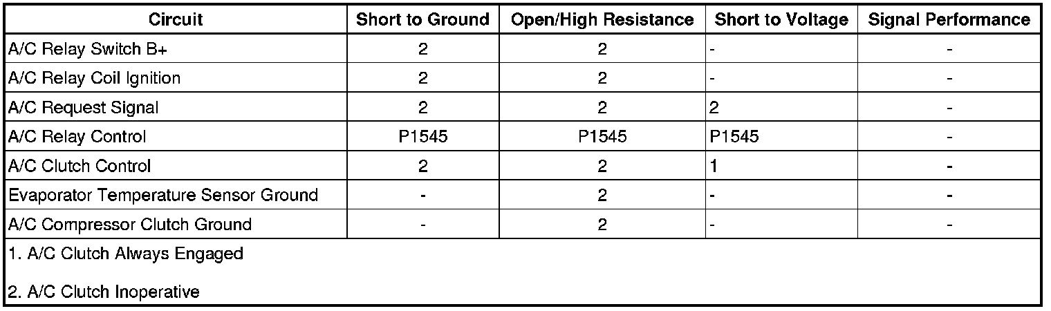 When the A/C switch is pressed, the HVAC control assembly sends a serial data message to the engine control module (ECM) for an A/C request. This input will request the ECM to ground the A/C compressor clutch relay control circuit, which will switch the A/C relay. With the relay contacts closed, battery voltage is supplied to the A/C compressor clutch assembly.