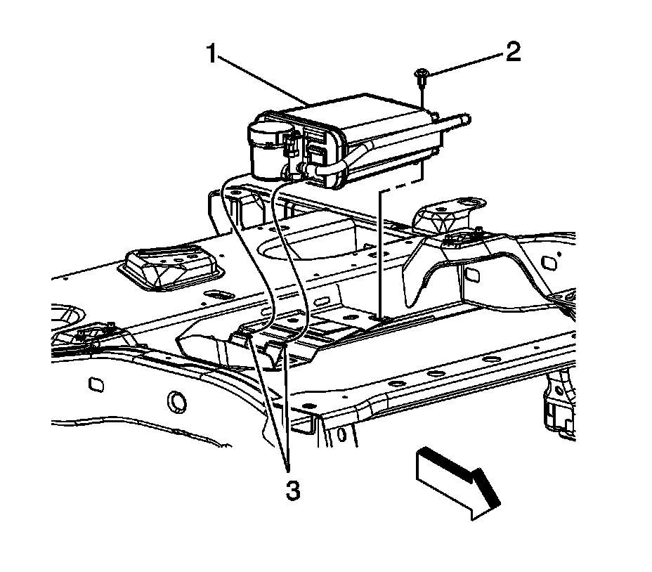 6. Disengage the EVAP canister (1) from the crossmember bracket tabs (3).
