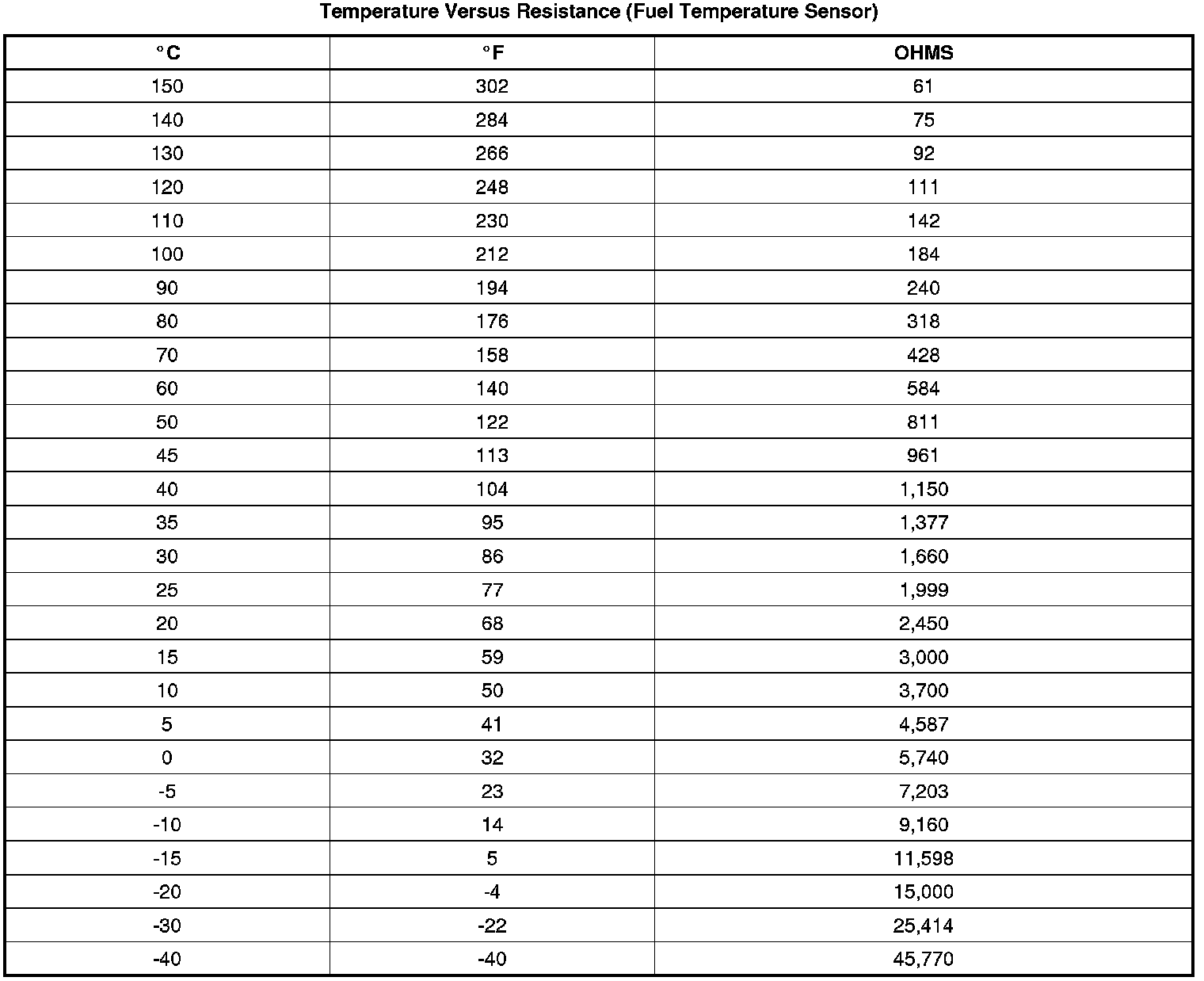 Temperature Versus Resistance (Fuel Temperature Sensor)