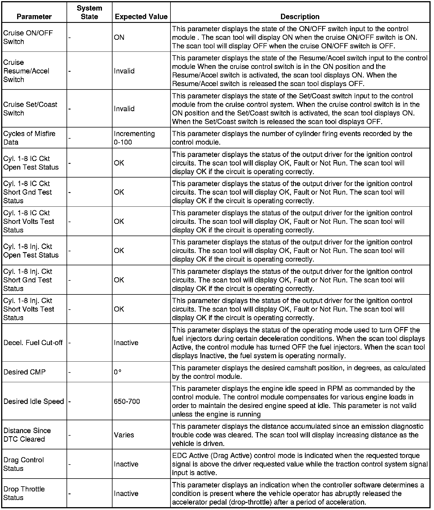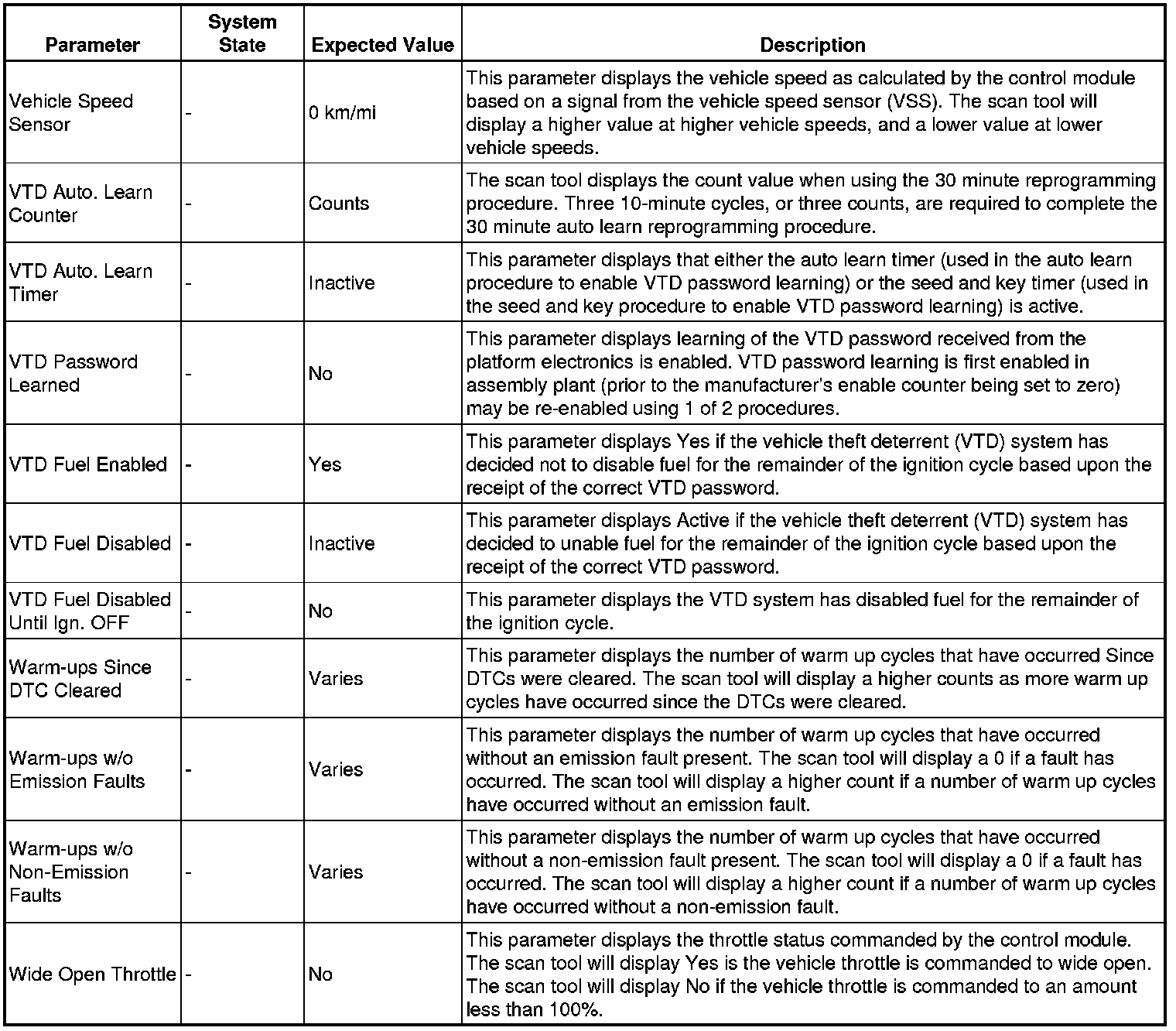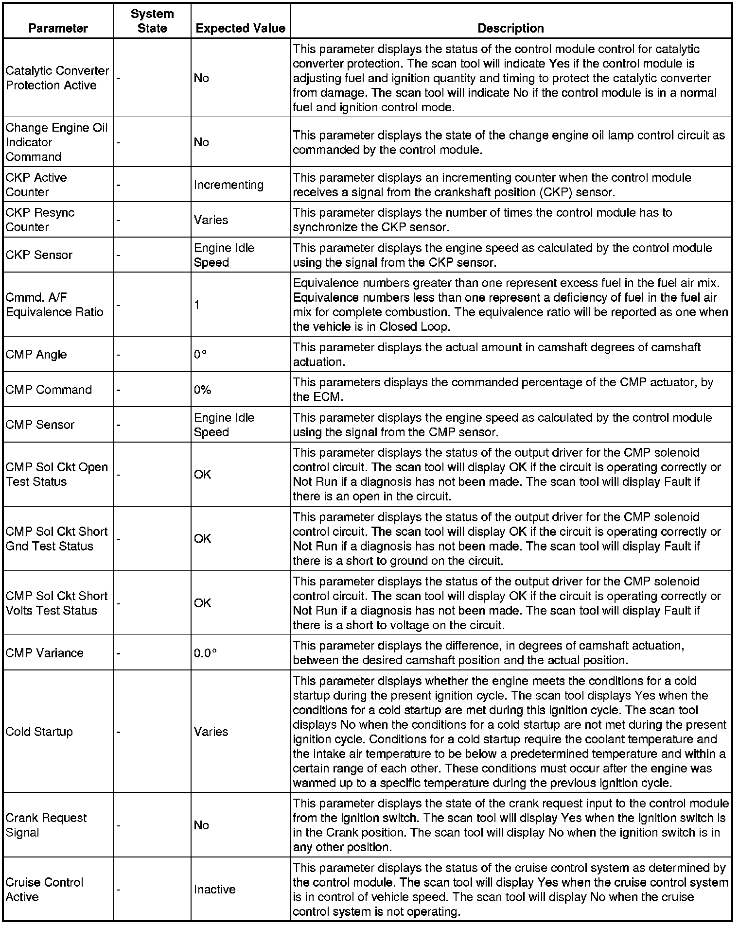 The Engine Control Module Scan Tool Data List contains all engine-related parameters that are available on the scan tool. The list is arranged in alphabetical order. A given parameter may appear in any one of the data lists, and in some cases may appear more than once, or in more than one data list in order to group certain related parameters together.