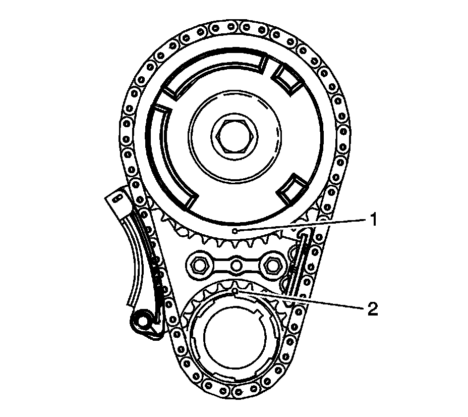 9. Inspect the sprockets for proper alignment. The mark on the camshaft sprocket (1) should be located in the 6 o'clock position and the mark on the crankshaft sprocket (2) should be located in the 12 o'clock position.