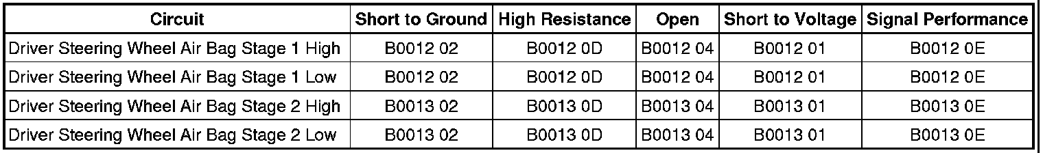 The driver steering wheel air bag high and/or low circuit is shorted to ground for 120 milliseconds.