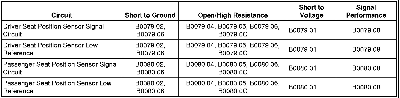 The SDM detects the seat position sensor signal circuit is shorted to ground or an open for 2 seconds.