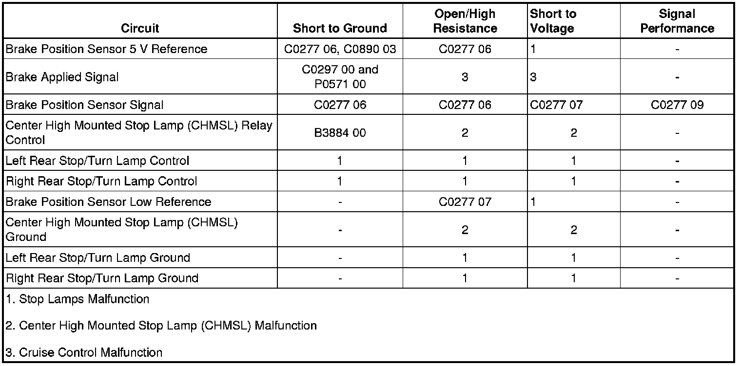 The brake pedal position sensor is used to sense the action of the driver application of the brake pedal. The brake pedal position sensor provides an analog voltage signal that will increase as the brake pedal is applied. The body control module (BCM) provides a low reference signal and a 5 V reference voltage to the brake pedal position sensor. When the variable signal reaches a voltage threshold indicating the brakes have been applied, the BCM will apply battery voltage to the right and left stop lamp control circuits, transmission control module (TCM), engine control module (ECM), and center high mounted stop lamp (CHMSL) control circuit.