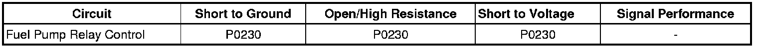The control module monitors the voltage on the fuel pump relay control circuit. If the control module detects an incorrect voltage on the fuel pump relay control circuit, a fuel pump relay control DTC sets.
