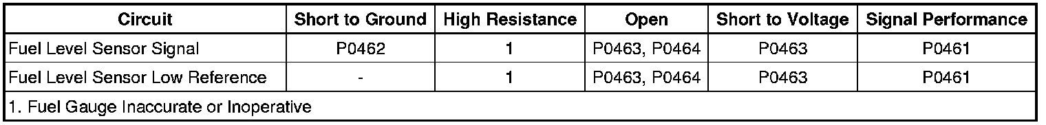 When the fuel tank is full, the sensor resistance is low and the ECM senses a low signal voltage. When the fuel tank is empty, the sensor resistance is high and the ECM senses a high signal voltage. The ECM uses the signal circuit of the fuel level sensor in order to calculate the percentage of remaining fuel in the tank. The ECM sends the fuel level percentage via the serial data circuit to the instrument cluster in order to control the fuel gauge.