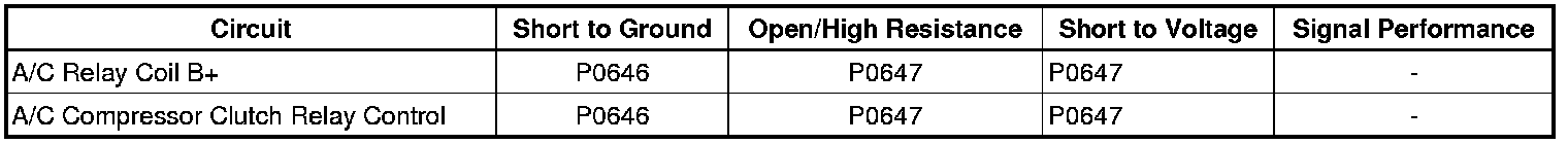 A short to voltage, short to ground, or open/high resistance is seen on the A/C compressor clutch relay control circuit.