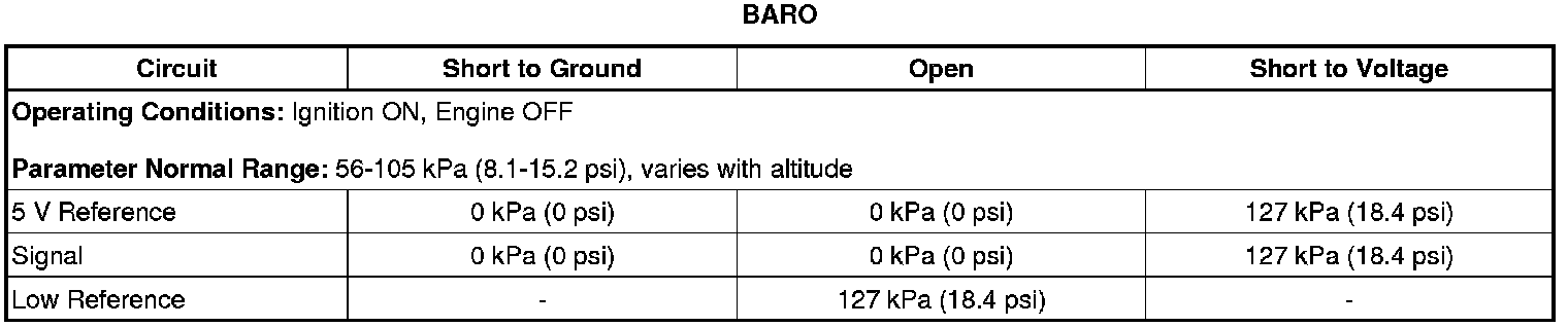 * Engine running, the ECM detects that the difference between the BARO signal and the calculated BARO is greater than 15 kPa (2.2 psi) when the vehicle has traveled no more than 0.6 km (0.4 mi) since the last calculated BARO update, or if the difference is greater than 20 kPa (2.9 psi) when the vehicle has traveled greater than 0.6 km (0.4 mi) since the last calculated BARO update.