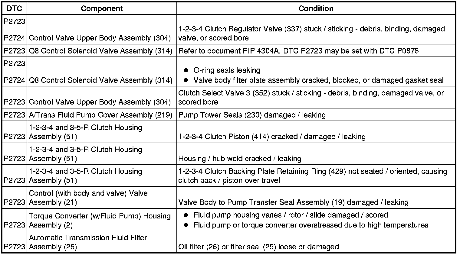 4. Listed in the chart below, are conditions for each component that could set DTCs P2723 or P2724. Carefully inspect each component for that condition. Repair or replace as necessary.