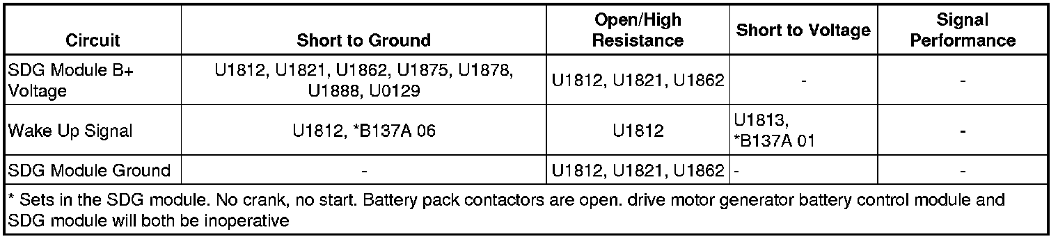 The serial data gateway (SDG) module translates serial data messages between the high speed GMLAN serial data bus, the low speed GMLAN serial data bus, and the high speed hybrid GMLAN serial data bus. Messages between the drive motor generator battery control module and the other hybrid system control modules must pass thru the SDG module. The wake up circuit sends a voltage from the SDG module to the drive motor generator battery control module to initiate certain module functions. DTC U1812 is set by the drive motor generator battery control module, but is stored in and reported by the hybrid powertrain control module (HPCM).