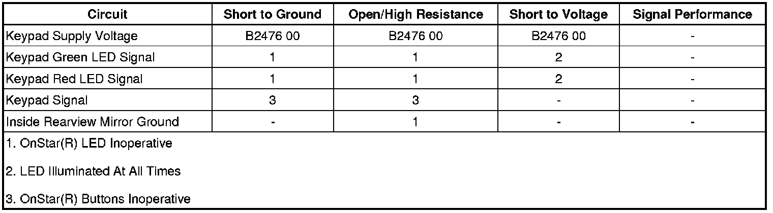The OnStar(R) status LEDs are located with the OnStar buttons. The green LED is illuminated when the system is ON and operating normally. When the green LED is green and flashing, it is an indication that a call is in progress. When the red LED is illuminated, a system malfunction is present. In the event there is a system malfunction and the OnStar(R) system is still able to make a call, the LED will flash red during the call. The OnStar(R) LEDs are controlled by the communication interface module (CIM) via the keypad green LED signal circuit and the keypad red LED signal circuit.