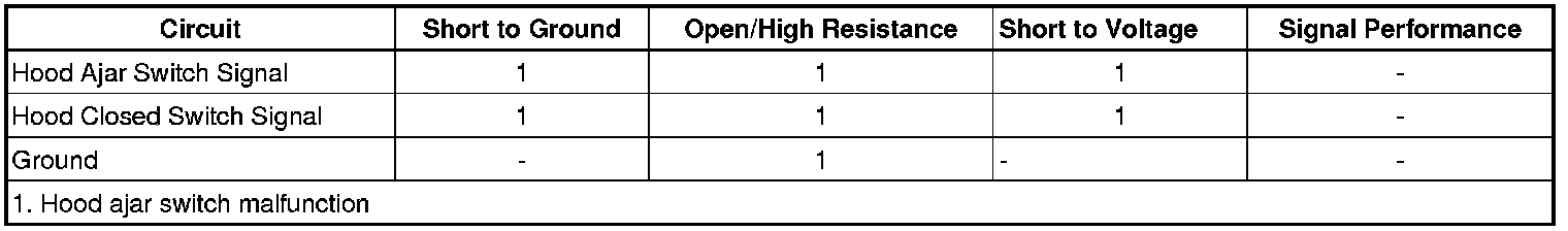 The body control module (BCM) monitors the voltage input of the hood open switch signal circuit and the hood open closed switch signal circuit. With the hood open, the hood ajar portion of the switch is closed, grounding the hood ajar switch signal circuit from the BCM, and the hood closed portion of the switch is open. With the hood closed, the hood closed portion of the switch is closed, grounding the hood closed switch signal circuit from the BCM, and the hood ajar portion of the switch is open. During proper operation, the two separate voltage signals at the BCM should never be at the same voltage.