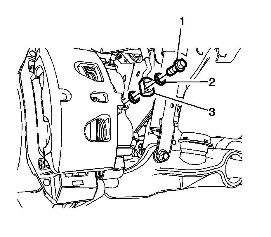 13. Assemble the brake hose fitting bolt (1) and 2 new brake hose fitting gaskets (2) to the brake hose fitting (3).