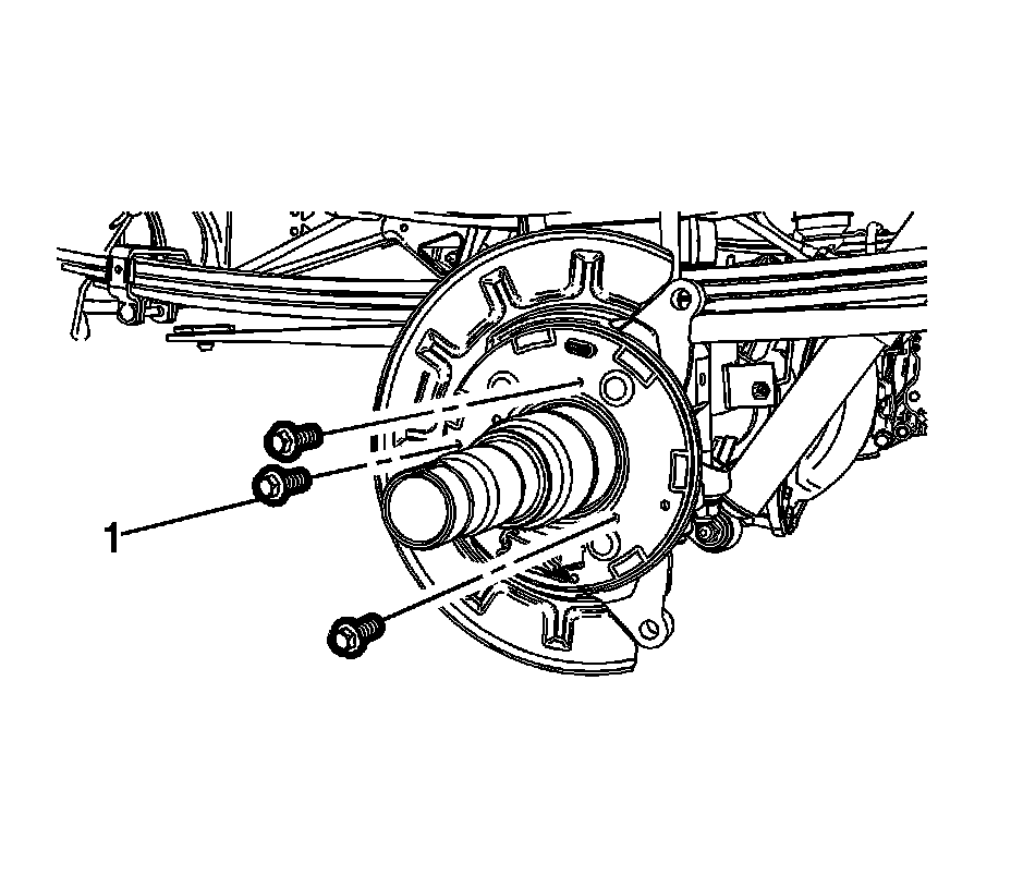 3. Install the rear brake backing plate bolts (1) and tighten to 10 Nm (89 lb in).