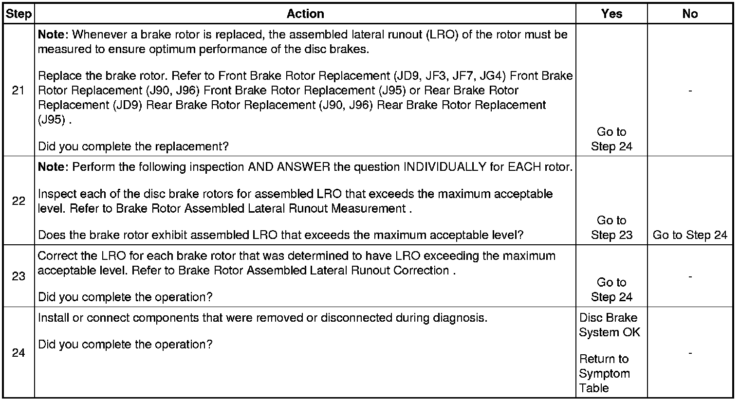 22. Disc brake rotor assembled lateral runout (LRO) that exceeds the maximum acceptable level can lead to thickness variation.