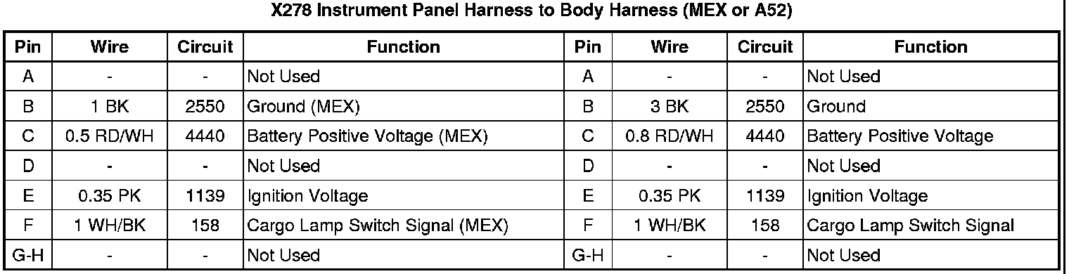 X278 Instrument Panel Harness to Body Harness (MEX or A52)