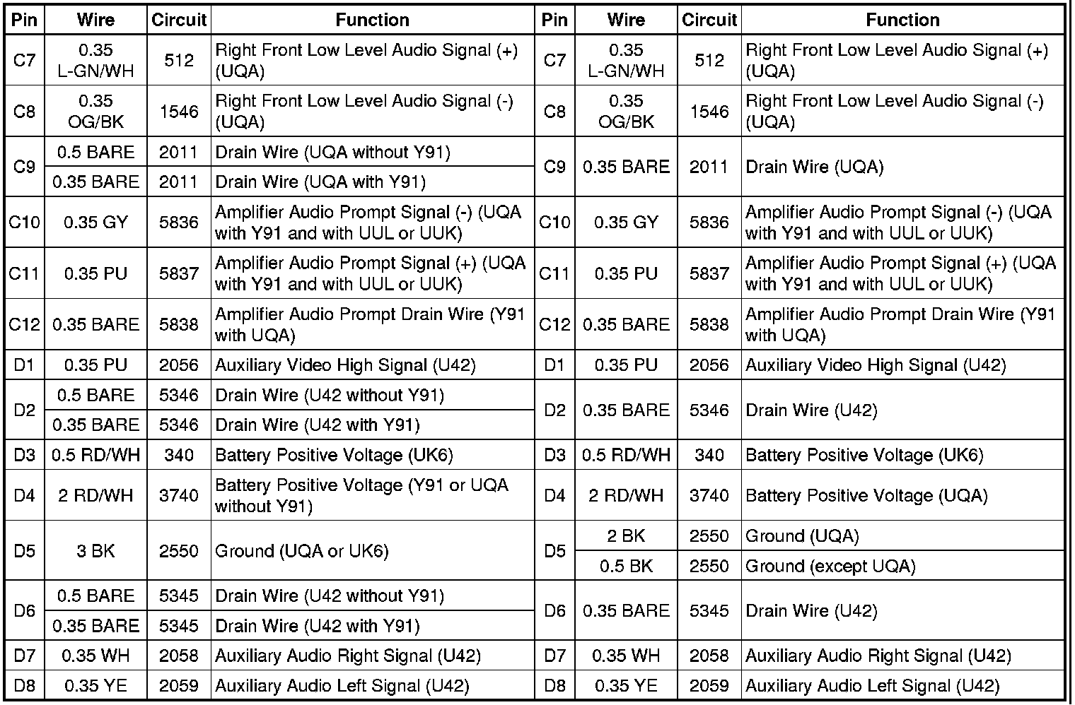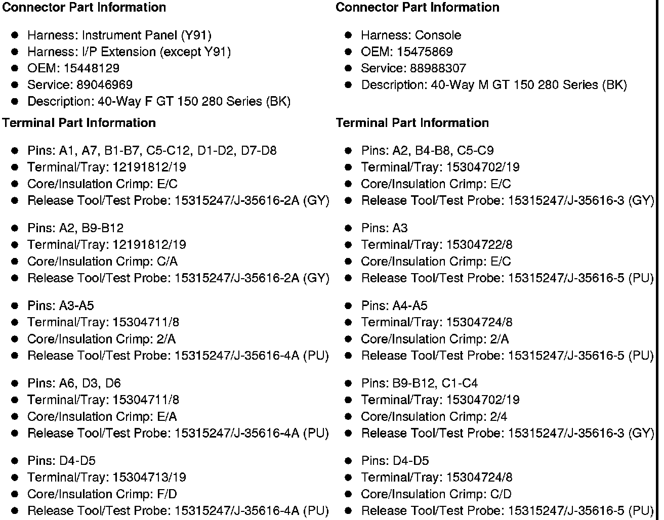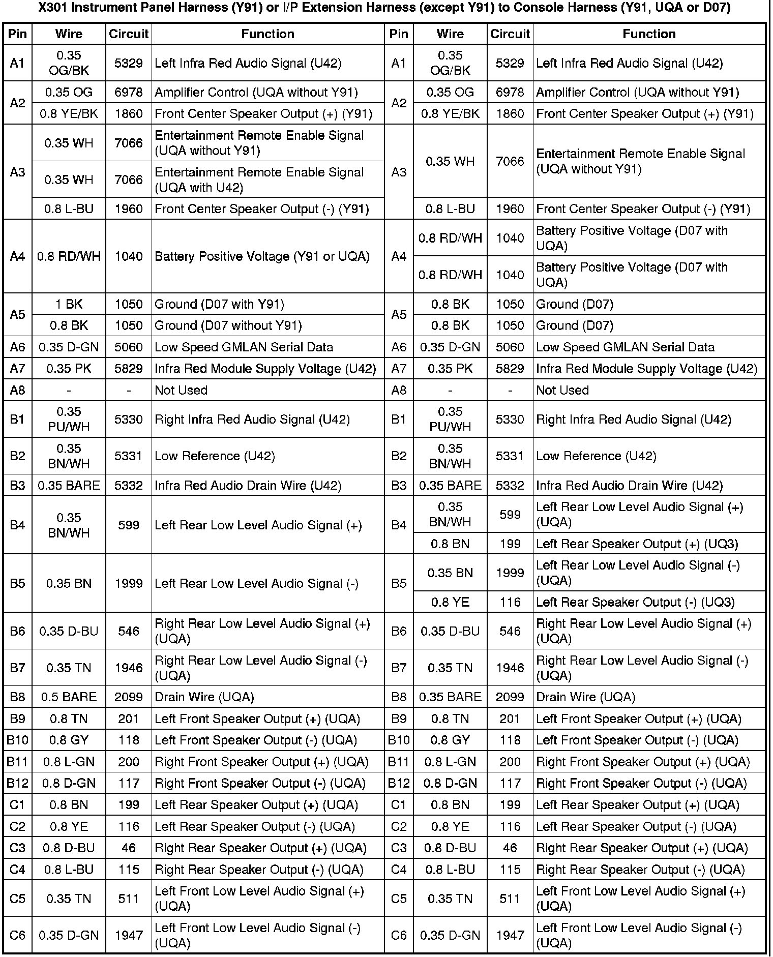 X301 Instrument Panel Harness (Y91) or I/P Extension Harness (except Y91) to Console Harness (Y91, UQA or D07)
