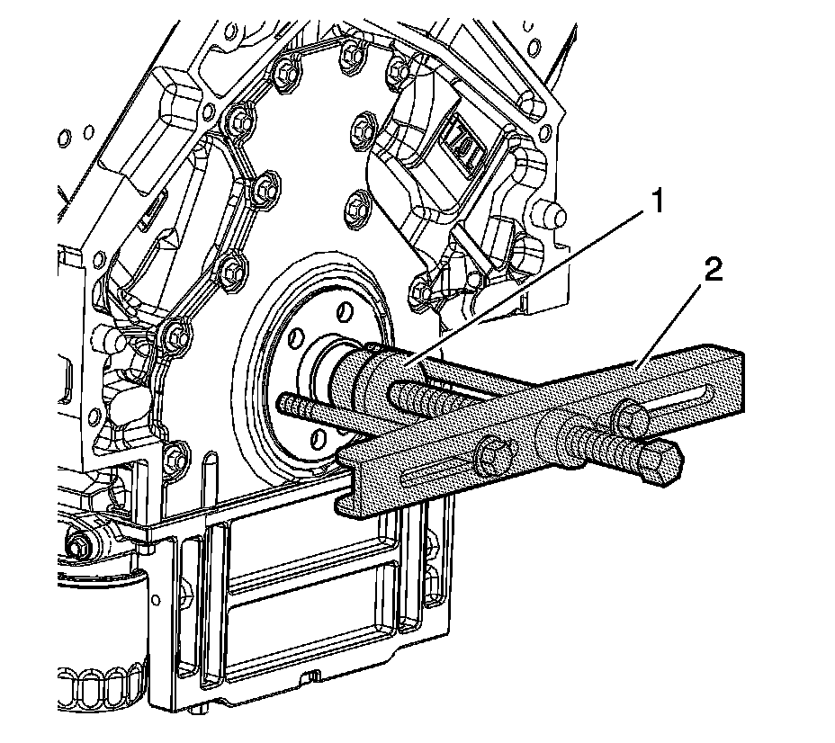 2. Assemble the J 8433 - two jaw puller (2), the J 45949 - pilot bearing and flywheel locator installer (1) and bolts to the rear of the crankshaft.