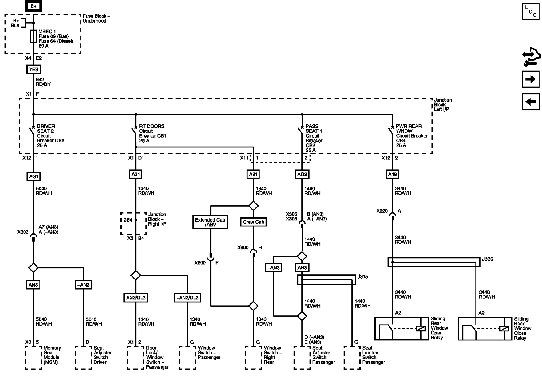 MBEC 1 Fuse and DRIVER SEAT 2, PASS SEAT 1, PWR REAR WNDW, and RT DOORS Circuit Breakers
