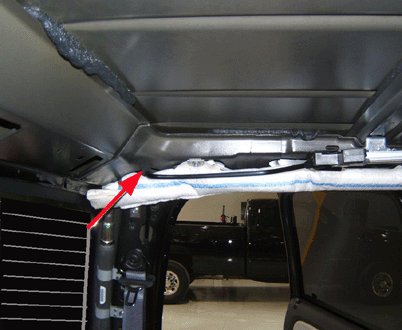 Lower the headliner and water test the roof/windshield area at the rearview mirror or the front right side. Once the leak path is verified, apply a bead of Kent Automotive High-Tech Clear Sealer (Part Number P10200 5 oz. tube), or equivalent, to the outside of the roof panel seam and reinstall the headliner.