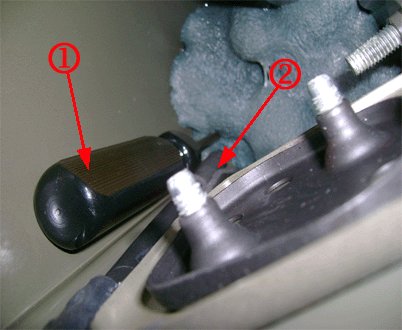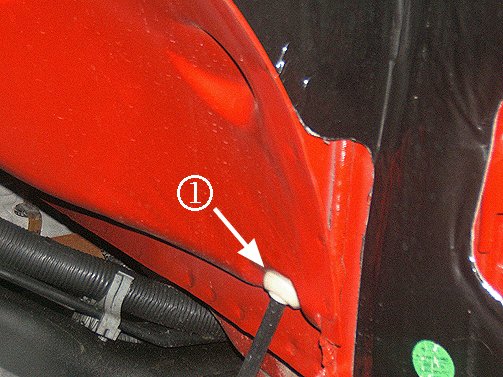 Create a drain hole in the foam block using a long screwdriver (1). The hole can be made anywhere within a one inch perimeter of the pillar cavity (EXCEPT for the inboard side of the pillar), and would be more effective if made in a low spot where the drain tube (2) empties into the cavity as shown above.