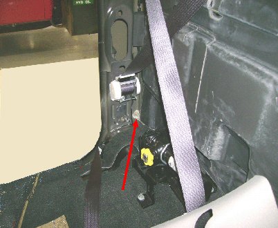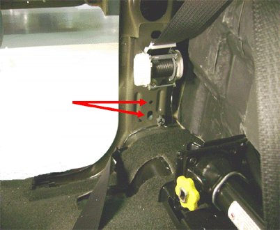 2. Install a butyl patch (sound deadener pad) over the two bottom holes of the rear pillar as shown above. When reinstalling the pillar trim panel, the retainers will pierce through the butyl patch and provide an adequate seal. Kent Automotive is one of the known sources for this patch. Contact Kent Automotive at 1-888-YES-KENT to obtain Kent P/N KT13306 or equivalent.