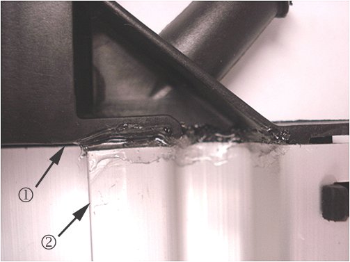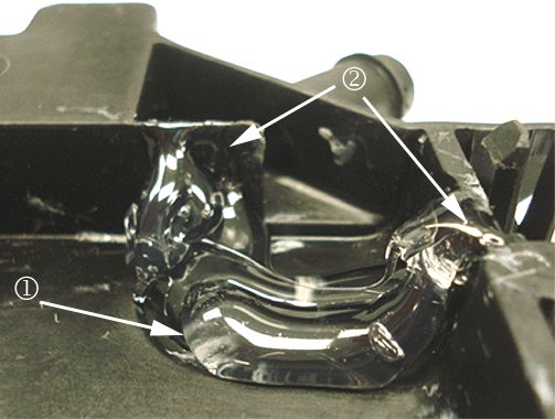 7. After installation, apply a second smaller bead of sealer to the top side of the end cap, where the plastic (1) meets the metal (2).