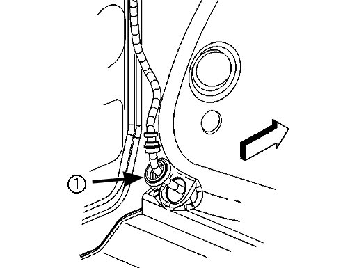 Remove the left side hinge pillar trim panel and position the carpet to expose the park brake cable pass-through grommet (1).